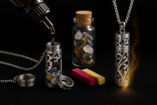 Alliez élégance et bien-être avec ce collier inoxydable, doté d'un pendentif recevant des pierres et huiles essentielles.