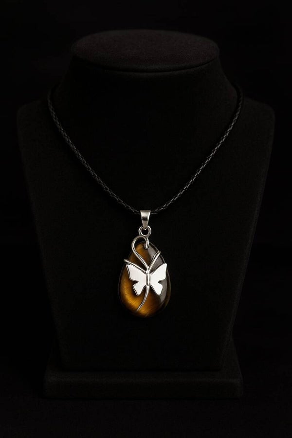 Collier pendentif en oeil de tigre orné d'un papillon blanc