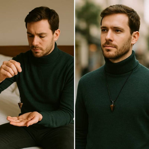 Découvrez notre collier pendentif pendule en oeil de tigre, taillé en pointe hexagonale.