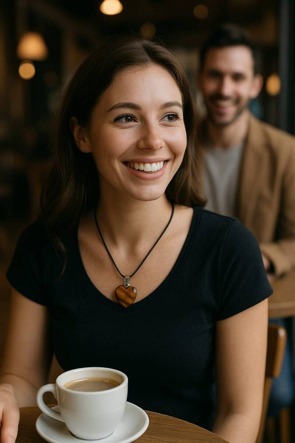 Découvrez notre collier pendentif en oeil de tigre, taillé en forme de coeur et mesurant entre 1 et 2 centimètres. Il est accompagné d'une cordonnette noire élégante, que vous pouvez personnaliser et changer selon vos envies et votre style.